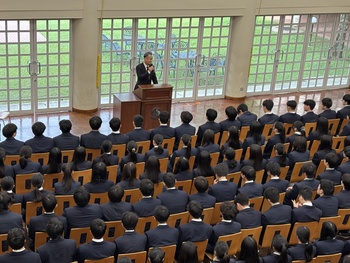 今回は、新たに式典の伴奏を担当する奏者の演奏に合わせて校歌斉唱が行われ、華やかな音色とともに、生徒たちの歌声がホールに響きました。さらに、式の後には編入生の紹介があり、温かい拍手に包まれながら新たな仲間を迎えました。