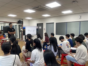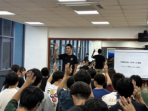 ご講演は、時にユーモアを交えながら、およそ15年間にわたってサッカークラブの社長を務められた貴重なご経験をもとに進められました。シンガポールにおける地域貢献を重視しつつ、世界に目を向けた事業戦略、そして2024年からは真のシンガポールのチームへと生まれ変わろうとするクラブの進化は、正に是永先生のバイタリティとホスピタリティ溢れるお人柄を表しているようでした。生徒たちは目を輝かせながら是永先生のお話に耳を傾け、多くの啓発を受けたようでした。その後、生徒たちは、熱気に溢れるホームゲームの雰囲気にも大いに感動して会場を後にしました