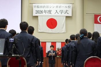 入学式では世界各地から集まった保護者の皆様に見守られるなか、新入生一人ひとりが呼名され、本校の生徒として認証されました。校長式辞では、多様な人々が共に暮らすシンガポールで学ぶ意義や、本校における多様な学びの価値について語られ、充実した3年間を実現するために、自ら問いを立て、探究し続けることの重要性が伝えられました。