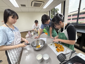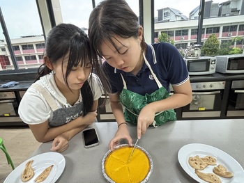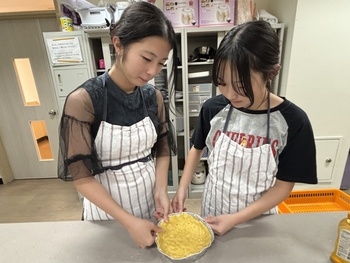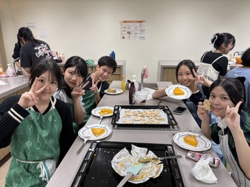 まず、パンプキンタルトを作る前に、ハロウィンの歴史について調べ学習を行いました。ハロウィンは、古代ケルト人の「サウィン祭」に由来し、秋の収穫を祝うとともに、霊的な世界とのつながりを意識する祭りでした。また、ジャック・オ・ランタンはアイルランドの昔話で、ジャックが悪魔を2度もだまし、死後彼は天国と地獄から受け入れを拒否され、天国と地獄のはざまを永久にさまようジャックに、悪魔が情けをかけ、かぼちゃのランタンと、明りを灯すための燃えさしを与えたことが起源ということを学びました。タルトを焼くのにかかる時間がとても長く、時間に追われながらの作業でしたが、かぼちゃの濃厚な味わいがとてもおいしいパンプキンタルトを作ることができました。
