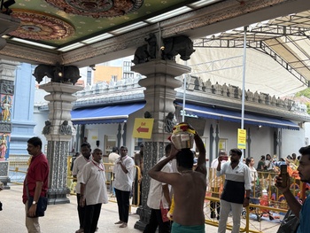 タイプーサムはタミル暦のタイの月(1~2月)、満月の日に行われる、ヒンドゥー教の神ムルガンが悪に勝利したことを祝う祭りです。祭りの参加者はムルガン神への感謝や贖罪を示すために48日前から禁欲的な生活をおくり、祭り当日は牛乳を入れたポットやカヴァディと呼ばれる飾りを担いでスリ・スリニヴァサ・ペルマル寺院からスリ・テンダユタパニ寺院まで約4㎞を行進します。特に敬虔な人びとは身体に数十本の鉤や串を刺してカヴァディを固定することでも知られ、こうしたタイプのカヴァディはインド本国以上にシンガポールやマレーシアで盛んだとも言われます。