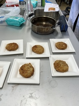 ワークショップの最後には、イビデン物産株式会社様からご提供いただいた、植物性タンパク質を用いた「ビーガンシュリンプ」を試食。新たな食材開発の可能性を、味覚という最も身近な体験を通して実感することができました。