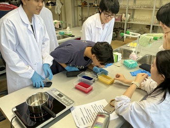 その後、豆乳に異なる量のレモン果汁を加えて加熱し、どの条件で最もタンパク質が凝集しやすいかを検証する実験に挑戦。多くの班で予想とは異なる結果が得られ、その理由について科学的根拠をもとに議論する姿が見られました。仮説検証のプロセスを実体験したことで、生徒たちは科学的思考の面白さと奥深さを改めて理解することができました。