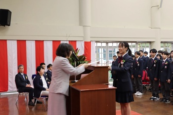 式中には、新入生代表による宣誓が行われ、「自調自考」の精神のもと、主体的に学びを深め、課題解決に取り組んでいく決意が力強く述べられました。また、2年生代表による新入生への「歓迎の言葉」が贈られ、温かく新入生を迎える雰囲気に包まれました。